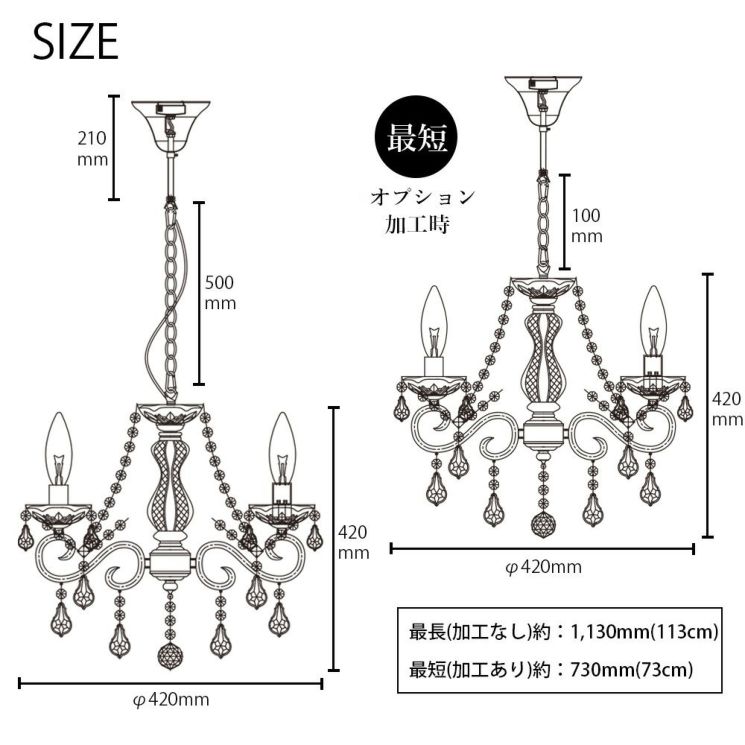 最短全長:730mm(チェーンを最短の100mmにした場合) |
