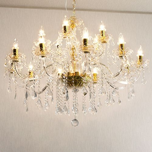 一段目に10灯、二段目に5灯のデザインに、たっぷりついたガラスパーツが煌びやかに光ります。