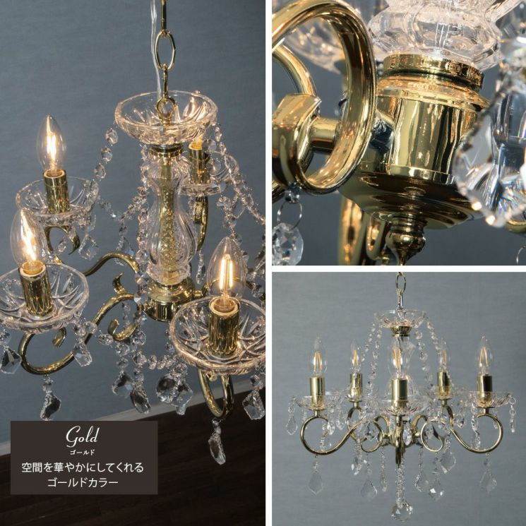 豊富なクリスタルガラスとガラスの受け皿が特徴の5灯シャンデリア【Henri アンリ】。
