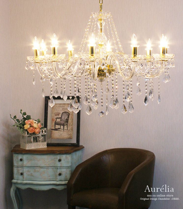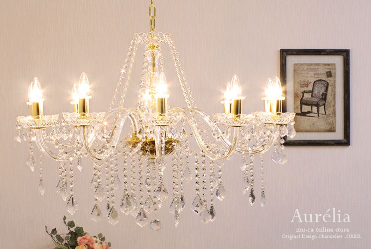 豪華なガラスの装飾がたっぷりついた10灯シャンデリア Aurelia(オレリア)。
