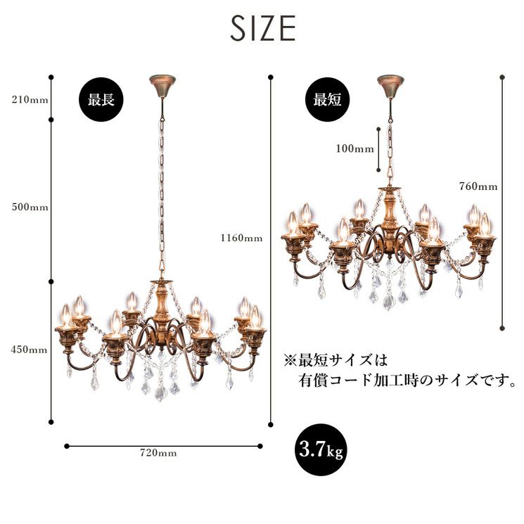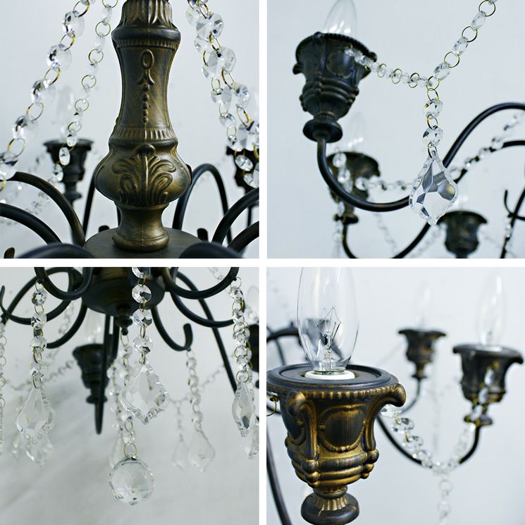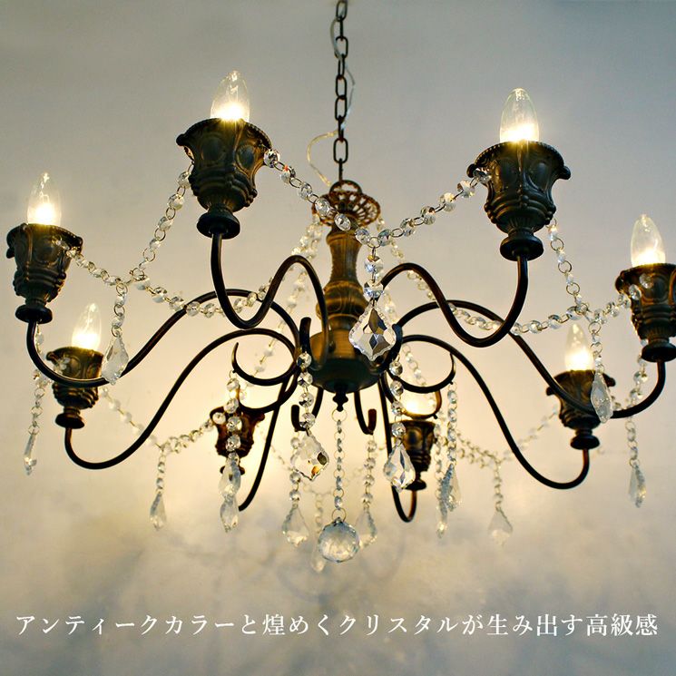 アンティークカラーのボディに贅沢につけられたクリスタルガラスが光を受けて輝き、ラグジュアリーな空間を演出します。